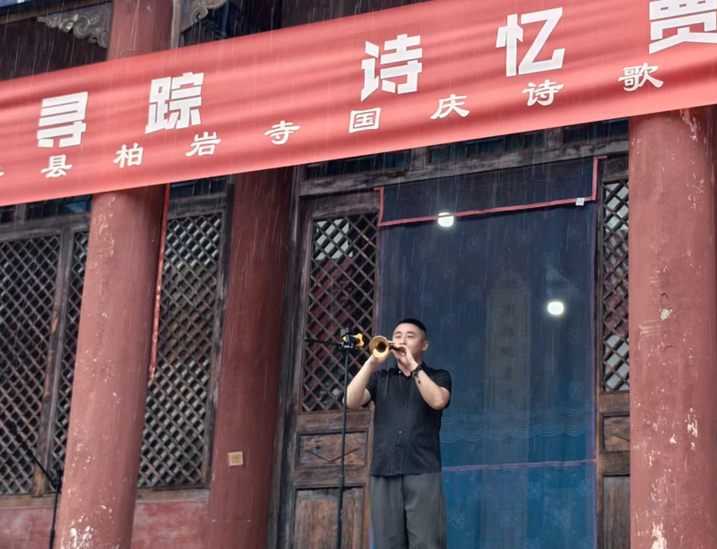 今天适逢寒露,柏岩寺在烟雨朦胧、群山环抱中,更加显得庄严清新,富有诗意禅思,活动首先由市佛协副秘书长、唐县佛协会长隆启法师致欢迎词,保定大自在乐队的一曲高亢嘹亮的唢呐独奏开启了活动的欢快节奏,著名诗人冯鹤菁先生为大家讲述贾岛和柏岩寺的渊源,剖析“鸟宿池边树,僧敲月下门。”的历史典故。据冯老师说贾岛的《寻隐者不遇》诗就是在柏岩寺写的。柏岩禅师的故事动人,现任柏岩寺住持行光法师为大家诵唱《柏岩禅师颂》,并重点解释“自嫌双泪下,不是解空人。”的深刻内涵,倡议“修行者”更要为人民服务,以社会主义核心价值观为引领。柏岩寺居士合唱队倾情演唱的《大海航行靠舵手》、《我的祖国》、《没有共产党,就没有新中国》,唱响了大家对党和祖国的感恩之情,引起了现场观众的共鸣。市爱心助力协会李明演唱的《明天会更好》将活动推向高潮。