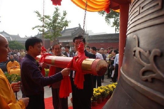 保定佛教资讯网讯:“千年古刹清幽雅致,佛门钟声悠远绵长,十月一日上午随着悠扬的钟声响彻保定上空,保定市佛教协会举行的国庆祈福撞钟法会活动在保定市真觉禅寺拉开帷幕,保定市部分党政领导和来自江苏、北京、广东、天津、内蒙、东北、洛阳等地的300多名信众、及游客参加了国庆祈福活动。佛教运用撞钟祈福法会这一庄严隆重形式,庆祝中华人民共和国成立60周年,祝福祖国国泰民安、繁荣昌盛。撞钟仪式于上午九时开始,但不少信众早早就赶到大慈阁,因场地有限,不少热切的信众只能在大慈阁周围遥听钟鸣。
