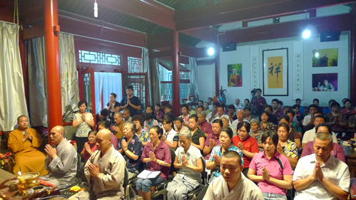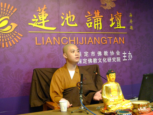 今天莲池讲坛邀请中国佛学院的普能法师来讲“静坐常识”,普能法师年轻有为、辩才无碍,其幽默的讲话赢得了阵阵掌声。