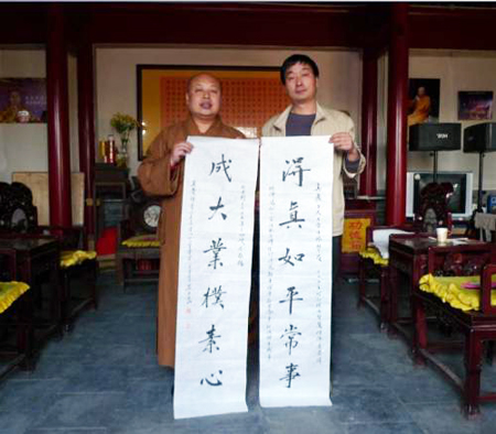 吴占良先生是保定著名的书法家、收藏家,中国书法家协会会员。保定市书协副会长兼秘书长。与师父相交已经很长时间了,深的师父的赞叹。今天下午吴会长来到大慈阁,马上兴致勃勃拿起了笔,就给师父写了一副对联“得真如平常事,成大业朴素心”。可见吴会长对师父也是评价很高的,从吴会长落款的小字当中就可以看出来了,“真广上人乃余方外挚友,上人少年即现大智慧,侍佛甚恭,得临济、沩仰二宗法脉正传,住持清苑观音禅寺,茹苦含辛。终使禅寺成为华北名刹,上人十五年之功也。今移锡真觉禅寺三年矣!余以十二字奉之,己丑三月吴占良”。这是十二个字正是师父的真实写照。因为师父这么多年来既是以平常心、以最朴实的语言待人接物。赢得了教内外人士普遍尊重。