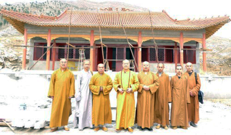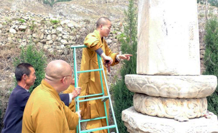 2009年4月14日下午,师父陪同明海大和尚参观游览了唐县金牛寺,在山坡的半山腰间巍然矗立着一座塔,名曰孚公禅师灵塔。孚公灵塔历尽岁月的洗礼,但是刻于塔面的文字依稀可见。随后,明海大和尚和师父在金牛寺住持隆难法师的陪同下,参观了正在修建的大雄宝殿,并合影留念。临走前,隆难法师还希望明海大和尚和师父在寺院建成之后前来开光!