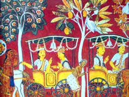太子至年十七。王为纳妃。简阅国中名女数千。无可意者。最后一女。名曰瞿夷。端正好洁。天下第一。贤才过人。礼义备举。是则宿命卖华女也。女子虽纳。久而不接。妇人之情欲。有附近之意。太子曰。常得好华。置我中间。共视之。宁好乎。瞿夷即具好华。又欲近之。太子曰。却此华有汁。污瘀床席。久后复曰。得好白氎。置我中间。两人观之不亦好乎。妇即具氎。又有近意。太子曰。却汝有污垢。必污此氎。妇不敢近。傍侧侍女。咸有疑意。谓不能男。太子以手指妃腹曰。却后六年。尔当生男。遂以有身。(注:氎,毛毯,厚的毛织物)