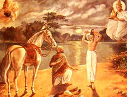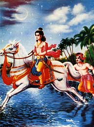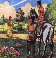 行数十里。逢两猎客。太子自念。我已弃家。在此山泽。不宜如凡人被服宝衣有欲态也。乃脱身宝裘。与猎者贸鹿皮衣。到前下马。遣车匿还。车匿长跪曰。今随大天。不可独还。太子曰。汝可径归。上白大王。及谢舍妻。今求无为大道。勿以我为忧。即脱宝冠及着身衣。悉付车匿。于是白马。屈膝舐足。泪如连珠。车匿悲泣。随路而啼。顾视太子。已被鹿皮衣。变服去矣