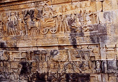即起上马。将车匿前行数十里。忽然见主五道大神。名曰贲识。最独刚强。左执弓。右持箭。腰带利剑。所居三道之衢。一曰天道。二曰人道。三曰三恶道。此所谓死者魂神。所当过见者也。太子到问。何道所从。贲识惶懅。投弓。释箭。解剑。逡巡示以天道曰。是道可从