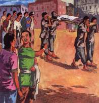 太子驾乘。出西城门。天帝复化作死人。室家男女。持幡随车。啼哭送之。太子又问。此为何人。其仆曰。死人也。何如为死。曰死者尽也。寿有长短。福尽命终。气绝神逝。形骸消索。故谓之死。人物一统无生不终。