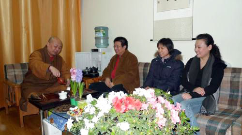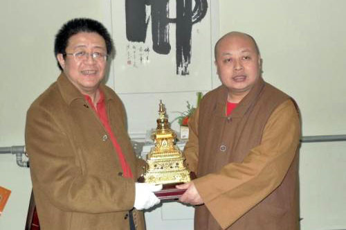 2009年2月12号下午,佛教在线总干事安虎生先生一行光临保定大慈阁,受到真广法师的热情接待。宾主就佛教教育、佛教发展等关心的问题进行了深入的交流。安先生并向大慈阁赠送一座鎏金宝塔。