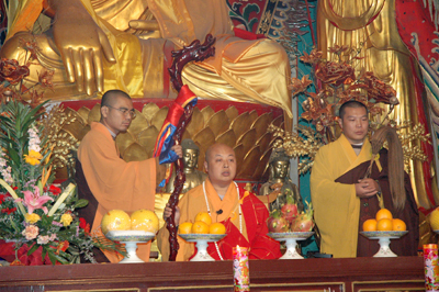 为祈祷社会祥和、国运昌隆、人民安康,保定观音寺在慈辉佛教基金会会长杨洪居士的支持下,于九月二十二日隆重启建为期五天的慈悲梁皇宝忏法会。法会延请六和僧,引领四众诵经、礼忏,施放瑜伽焰口、打上堂斋、供天、放生等活动。来自保定及周边地区的居士信众听闻后纷纷随喜参加,共将近1000人参加了此次法会。道场殊胜稀有、法会隆重庄严,与会信众个个虔诚竭敬、法喜充满,法会取得了圆满成功。(图为观音寺住持真广法师在主法)。