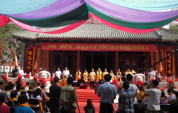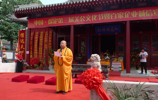 上午,在位于市中心的关岳行宫,彩旗飘飘、锣鼓宣明,熙熙攘攘的聚满了来参加文化节的社会各界人士。保定市企业家协会会长王庆明代表企业界作了讲话,接下来由莲池区副区长张杰宣布文化节开幕,开幕式上,市佛协会长真广法师在讲话中指出:我们举办这样的文化活动,简单地讲就是为了倡导一种诚信精神,提倡诚信能使你的财运更好;诚信能使你的家庭更和谐;诚信能使你的前途无限光明。在文化节上的一项精彩的活动吸引了大家,就是百家企业、公司共同在一起举行“我诚信”的宣誓活动,宣誓在自己的商业活动中,做到诚实守信,不欺诈,不售卖假货等。文化节还有一项重大精彩的活动是:“关公巡城”,即由数量盛装的彩车,沿老保定古城区绕城一周,即从关岳行宫出发延天威路西行——环城西路——环城北路——环城东路,最后回到关岳行宫!花车上载有象征忠义信的关公塑像,以及各种宣扬诚信友爱精神的大幅宣传画等。
