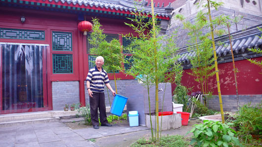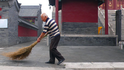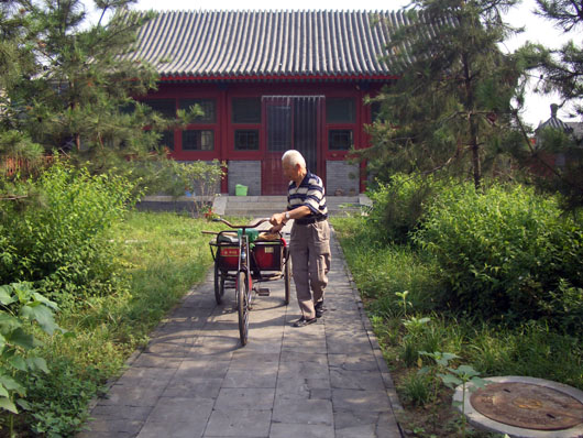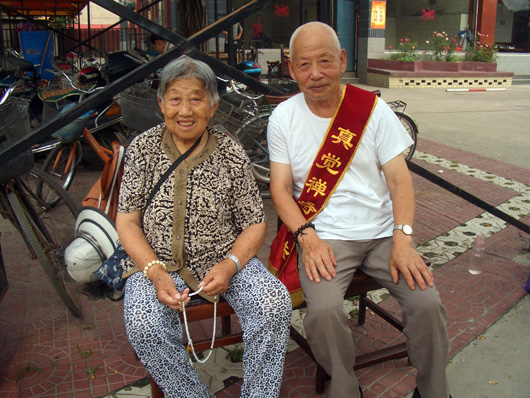 每天清晨就有一位78岁的老翁用小三轮车带着83岁的老伴一同到大慈阁院内打扫卫生。