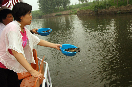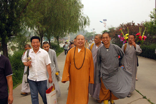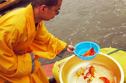 2008年6月13日香港慈辉佛教基金会在白洋淀放生,保定市佛教协会会长真广法师、观音寺代住持真源法师应邀主法