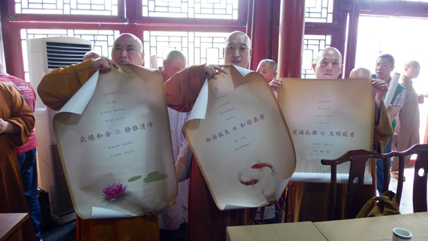 会议最后,还为各寺院发放了中佛协关于文明敬香、科学放生、共建清净和谐场所的宣传海报。