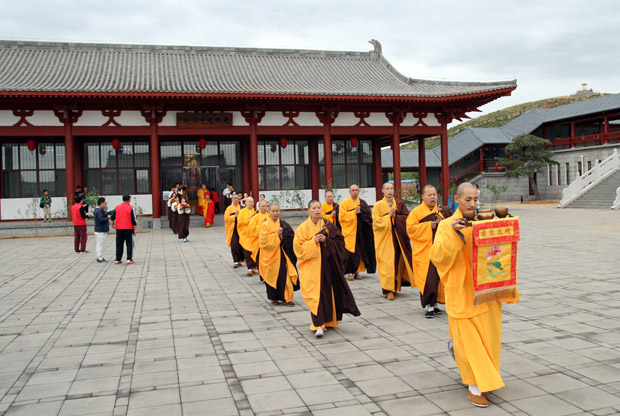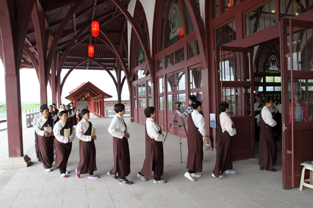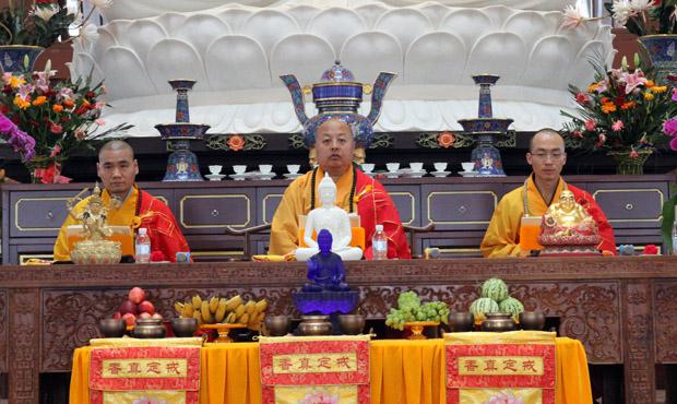 5月2日,在满山翠绿的映衬之下的大佛光寺,布置在大雄宝殿的戒场神圣庄严,天气也一改昨日的炎热,变得分外清凉,南无本师释迦牟尼佛悠扬的佛号声从殿中传出,由法师和戒子代表组成的仪仗开始迎请三师进入戒场。