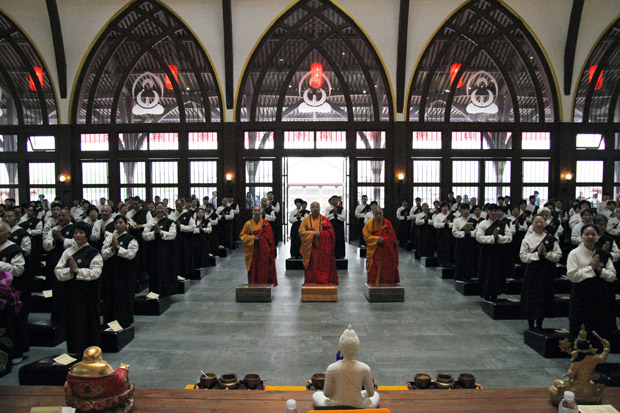 此时的殿外,天降甘露,雨声响起,众菩萨戒子法喜充满,心怀感恩,法会至此圆满。