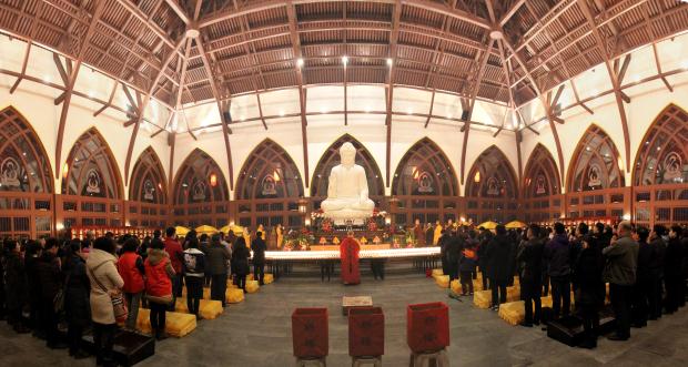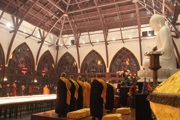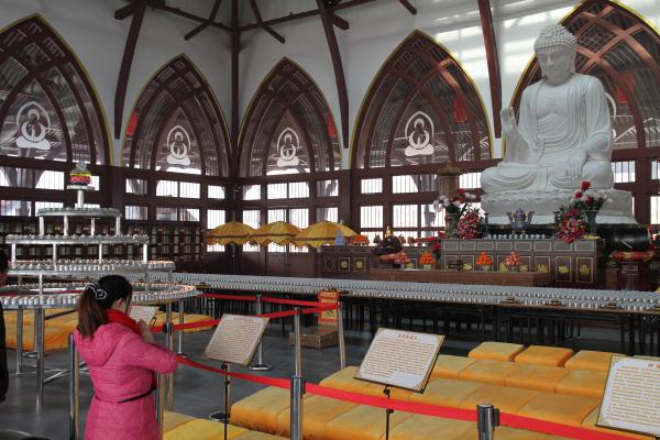节日的大佛光寺殿堂庄严整洁,处处悬挂着喜庆的大红灯笼,尤其是大雄宝殿独特的钢架结构建筑,从内到外都给人庄严、大气、亲切的感觉。正中端坐的释迦牟尼佛,面如皎洁的满月,慈悲祥和,殿前广场上的数万盏祈福灯,天上圆满的明月,更是将整个寺院映衬的美轮美奂。