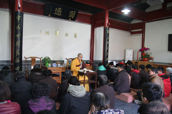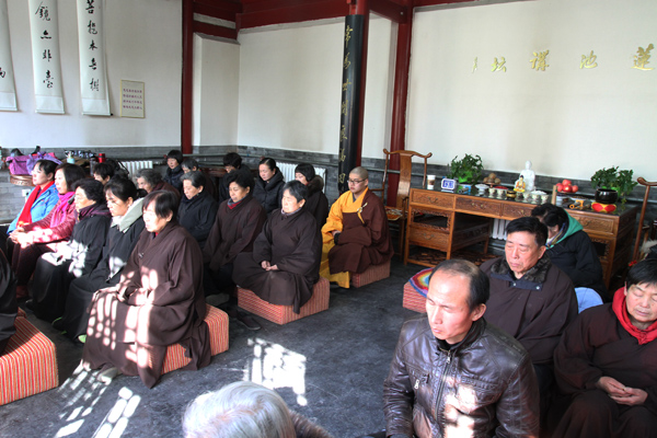 上午八点半,在大慈阁方丈厅“莲池讲坛”内,坐满了来听经、念佛共修的居士。大众熏修希胜进,十地顿超无难事,首先由道悦法师为大众开示净土念佛法门的种种殊胜妙义,阐释了“信”的重要性,以及念佛实修的种种方便,并亲自指导大众诵经、念佛、静坐,在洒满阳光的大慈阁“兜率内院”里带领大众摄心绕佛。