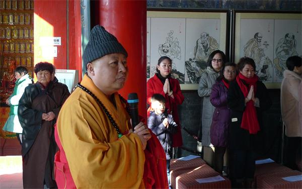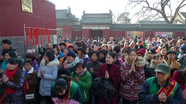 保定佛教资讯:2016年2月8日,农历大年初一,阳光明媚,天气回暖,保定大慈阁院内游人如织,大家扶老携幼纷纷来到寺院祈福参观,亮丽的年轻人们和小朋友们欢快的嬉闹声成了寺院里一道特别的风景,一如往年,大慈阁举行了祈福赠送“平安面”法会。