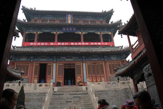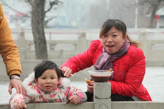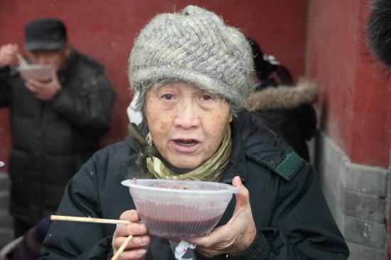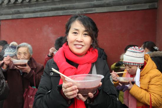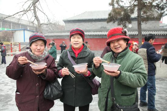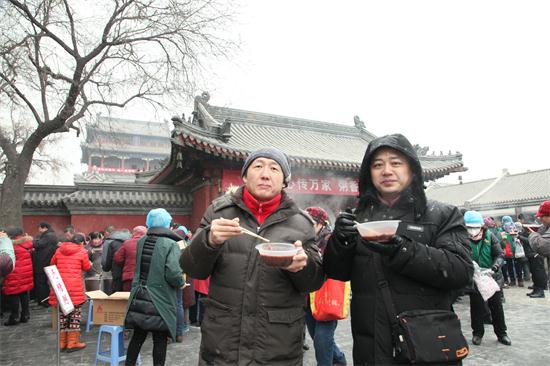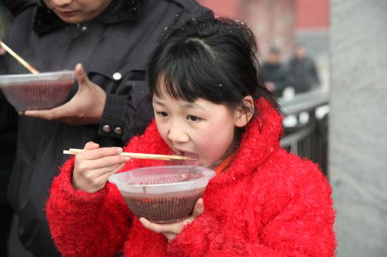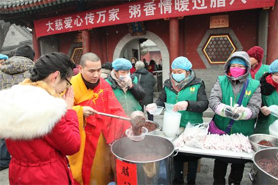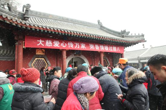 今年的腊月初八,天气比往年要寒冷许多,义工们在早上六点就来到了寺院,开始点火熬粥,不多时,腊八粥的香气伴随着纷纷扬扬的雪花随风飘散开来,大慈阁的里里外外充满了喜庆的气氛,从游客到信众,无不为这气氛所感染。