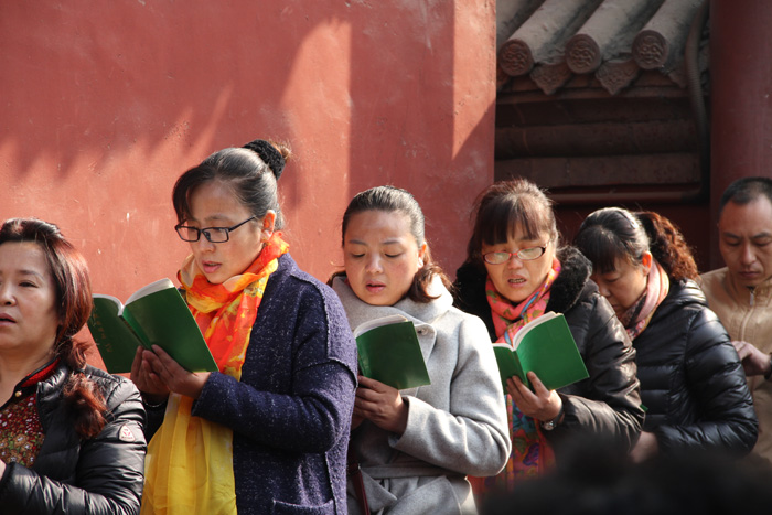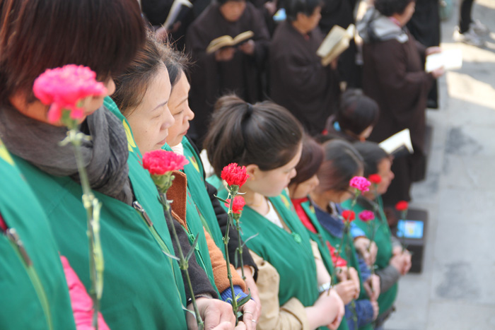 法会举行了献花、献供、放生、皈依等内容,殿内殿外的大众共同恭读了《法华经——观世音菩萨普门品》,“妙音观世音,梵音海潮音,胜彼世间音,是故须常念”美妙的梵音在大慈阁的上空回荡。