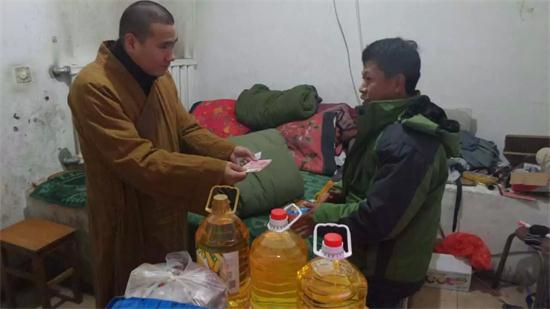 保定佛教资讯:2015年11月20日,“关爱孤寡残、送福到万家,”大慈爱心社在社长真广法师的指导下,持续开展暖冬“献爱心、送温暖”活动,今天早晨,爱心社一行在副社长道悟法师带领下,冒雨奔赴顺平县神北村看望贫困孤寡老人,为他们送去棉被、米、面、油等物资,帮助他们度过寒冷的冬季。同时帮扶的还有一个家庭贫困的学生郝佳伟,今年8岁,父母去世,去年他爷爷也去世了,现在跟着大伯相依为命,爱心社这两年也一直帮助他,此次,给他们带来了被褥和米面油等生活用品以及李洪洋、卢宁为他捐助的一千元善款。