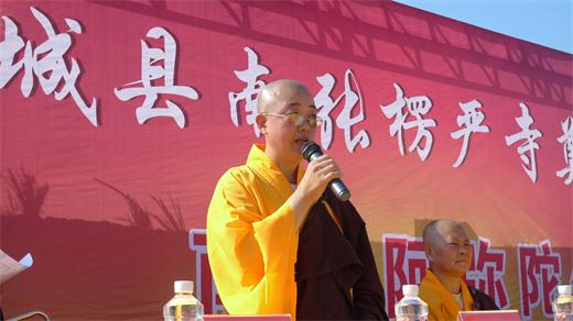 上午九点三十,庆典正式开始,首先由楞严寺住持妙净法师致欢迎词,感谢各位领导,各位高僧大德的光临支持,接下来由市民宗局一处甄彩霞致贺词,她讲到:楞严寺在党和政府的支持下,寺院功能不断完善,管理日益规范,希望楞严寺在妙净法师领导下,从基础做起,续佛慧命,庄严国土,利乐有情,依法开展宗教活动,积极走与社会主义社会相适应的道路,最后祝法会圆满成功,各位嘉宾身心安康。