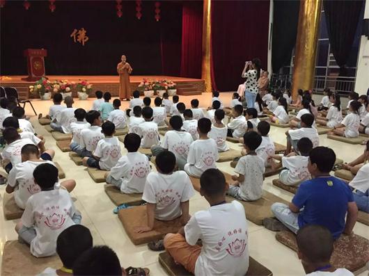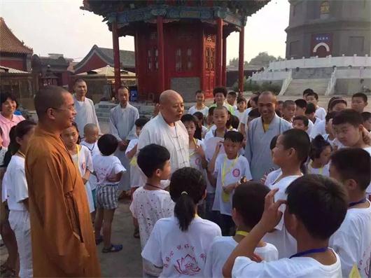 下午,市佛协会长真广法师来到观音寺看望小朋友们,小朋友非常喜欢真广法师,围着法师问这问那,真广法师嘱咐孩子们:在寺院大家一起好好玩(这几天就不要写作业了),并祝愿小朋友欢乐营圆满举办。
