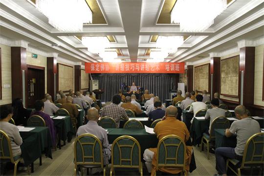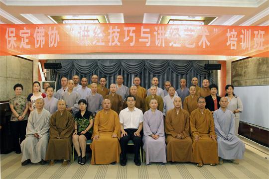 保定佛教资讯:为了增强保定法师的弘法讲经的综合素质,2015年7月9——12日,市佛协举办了“讲经技巧与讲经艺术”培训班,特邀请邯郸佛协副会长兼秘书长会空法师来保授课,市民宗局局长董少卿、一处甄彩霞处长莅临了此次培训学习,参加培训学习教职人员及居士近40人。