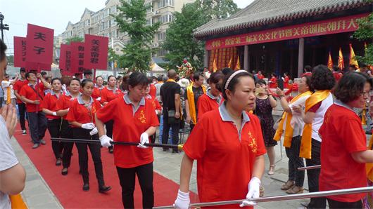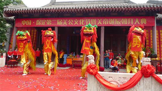 活动从上午八点开始,此次关公文化节比第一次文化节活动的规模还要大,典礼更加庄重,文化氛围浓厚,参与人更多。文化节开幕,首先有众多文艺节目表演如:戏曲、古筝等各有特色,表演精彩。之后由市委宣传部部长王淑艳女士讲话,王副部长赞颂文化节活跃了保定古城文化氛围,同时希望关公文化节能够传播中华文化传统美德和忠、勇、仁、义、礼、智、信精神,推动保定文化文明建设,为京津冀一体化做准备。接下来典礼祭祀人员肩披黄色祭带向护国佑民的伽蓝菩萨、中华武圣关圣帝君敬献花篮礼拜,礼毕,由保定佛教界众法师为大众祈福、上香,最后进行了舞狮表演;龙狮开道,特色的表演让民众大饱眼福,特别是两组狮子叠到一起来舞动,难度很大,博得了现场观众的阵阵掌声,也为之后的关公巡游增加了氛围,随后由八抬大轿起轿,抬关公巡街送财,一路上吸引了众多行人驻足,大家纷纷双手合十以表恭敬,巡街结束,回到伽蓝殿后信众礼拜,活动圆满结束。