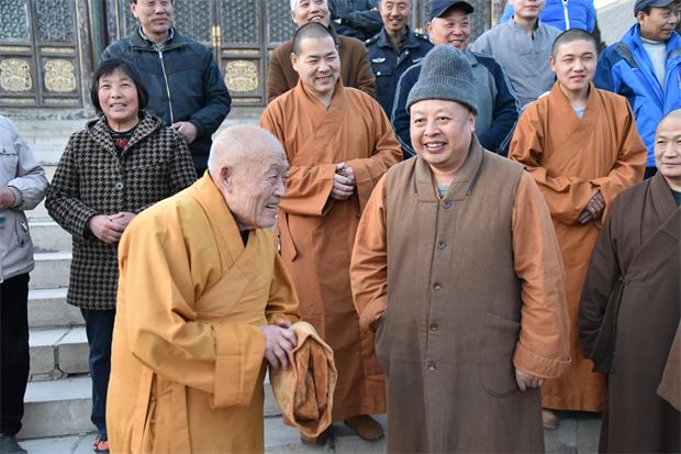 在观音寺,会长真广法师询问了寺院“三月三”大庙会的准备情况,并看望慰问了观音寺几个上了年纪的老法师,看到几个老法师身体状况都很好,很高兴。特意嘱咐住持寂禅法师等法师,一定要安排照顾好这些年老法师的生活,让年轻的法师发心去照顾年老的法师,使其老而无忧,让好传统久远相传。