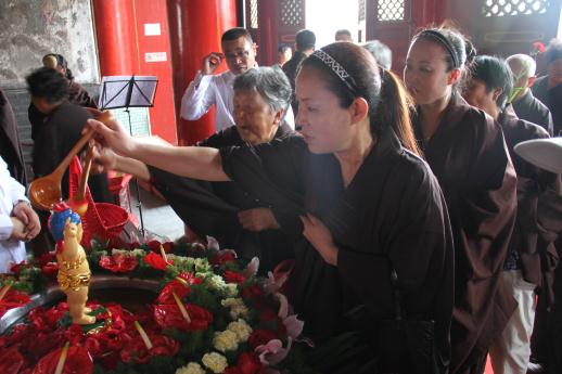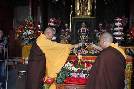 释迦牟尼佛诞辰日,我们以鲜花及心香一瓣供养佛陀、赞颂佛陀并沐浴太子圣像,藉此洗除我们内心的“贪嗔痴”三毒,增长福慧!并祈愿三宝加持,国泰民安,社会和谐,欢迎大家莅临,同沾法喜,共浴佛恩!随后在真广法师带领下,大众依次献花浴佛。