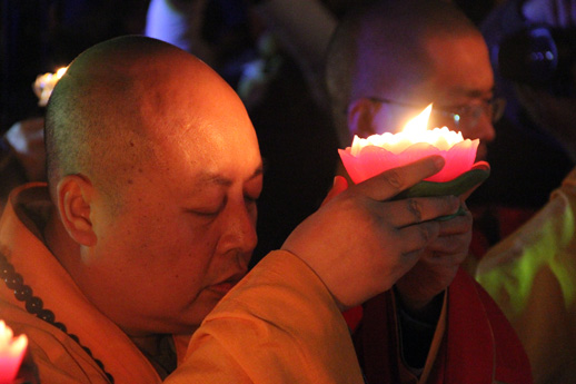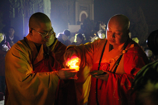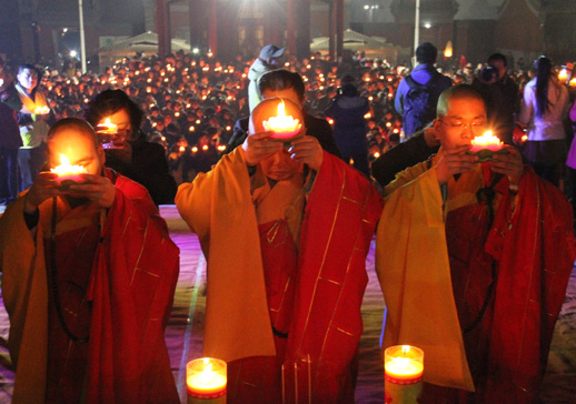 接下来,真广法师在佛前引燃了吉祥莲花灯,并将象征着慈悲、光明力量的灯火传与寂禅法师、道悟法师、道和法师及四众弟子,带领大众共同祈愿,一时间大众灯灯相传,大殿前广场顿时成了灯的海洋,大众依次将灯传至大殿,供在佛前,不多时大殿正中有序的摆放了代表千余大众心愿的莲花灯千余盏,把大殿映衬的格外美丽庄严。