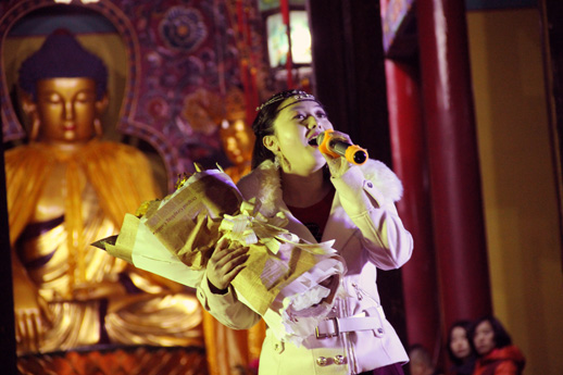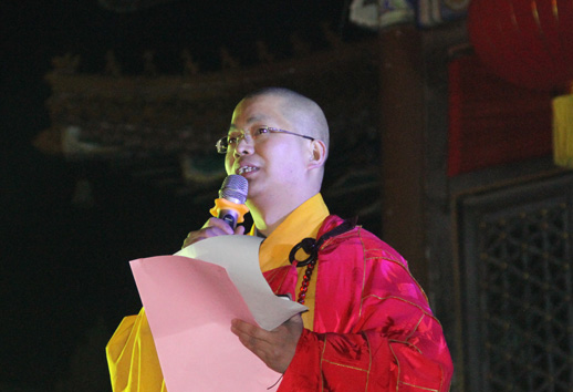 晚7时,在观音寺大雄宝殿前,伴着“本师释迦牟尼佛的佛号声,法会正式开始,首先为大家表演了文艺节目:有悠扬的佛教歌曲、传统的武术、激情的诗朗诵《感恩》:感恩伟大的祖国、感恩亲爱的党、感恩我的老师、感恩我的父母、感恩是一种力量,拥有一颗感恩的心,我们就会拥有快乐、拥有幸福、拥有一个美好的未来。
