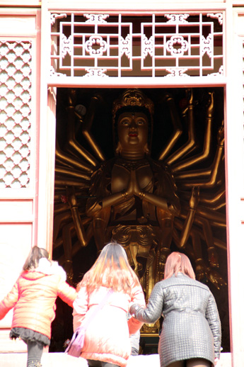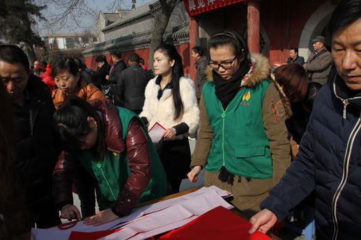 保定佛教资讯:2015年2月11日,农历12月23,是传统的民俗“小年”,天气晴好,阳光灿烂,真觉禅寺内挂红飘彩,人流涌动,一派节日的喜庆繁忙气氛。在会客厅真广法师为法师们开示:要发扬大乘佛教精神,要主动走出去弘化四方,要做新时代的僧人,要敢于担当;在殿堂上道悟法师、道谦法师带领信众举行佛事活动;在山门前的广场上,是寺院邀请的市书法家协会、十方书画院、明见精舍、安新画院的众多书法家,为大众义务书写春联福字。