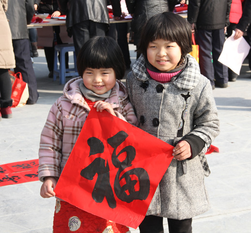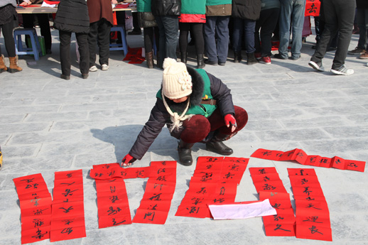 上午九点半,在真觉禅寺(大慈阁)山门前的广场上,熙熙攘攘的挤满了人,市佛教协会会长真广法师、著名画家苗冬青老师、河北省书协副主席吴占良、王法明、刘五辈老师及众多的书法名家等,泼墨挥毫为大家书写一幅幅对联福字。