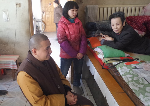 在李重芳家,老人因多病导致生活困难,现在住的房屋也属于危房,没有什么收入,前两年一场车祸,又雪上加霜,智力又受到影响。此次,爱心社为老人带去日用品及资金,为使老人干干净净过春节,大家还为老人做了一些简单的家务,爱心社的慰问,老人非常激动,感动得不知说些什么好!道悟法师表示,以后还要持续的关爱这些老人。