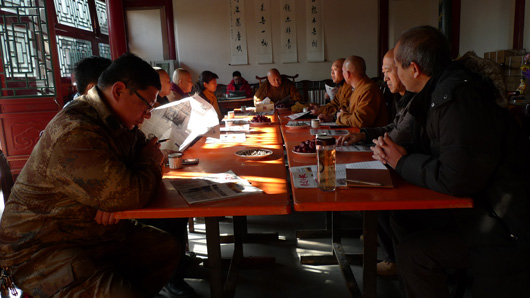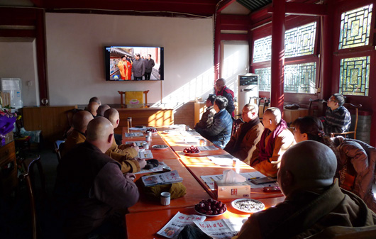 与会者首先观看了政协俞正声主席在大慈阁调研的视频及图片资料,学习了俞主席的讲话,并各自就讲话精神谈了自己的感受。会长真广法师与大家分享了自己在接待俞主席等领导时的感受:俞主席到大慈阁来调研,意义重大,是对保定佛教乃至全国佛教界的鼓励和认同,“精心做好宗教工作,服务经济社会发展”是党和政府对宗教工作的最先进表述,今天又恰逢立春,一年之计在于春,是新的希望的开始。我们保定佛教同仁更要以俞主席来视察为契机,精进努力,再接再励,把我们的各项工作做的更好,发挥佛教的心理疏导、稳定情绪、化解矛盾等功能,为社会稳定和谐做出努力,不辜负党和政府对我们佛教工作的期待,争取以更大的成绩来回报国家,回报社会!