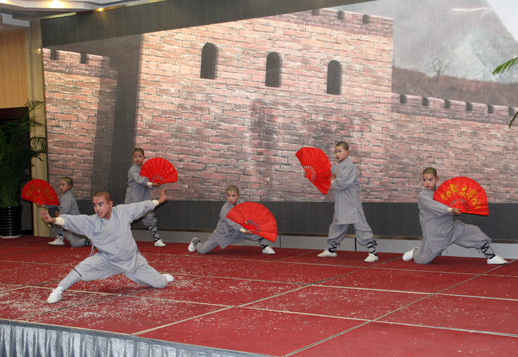 晚会上小朋友们天真、欢快的舞蹈和少林武校阳刚的武术表演都给大家留下了深刻的印象,尤其是京剧演员费翔的京剧演唱和著名音乐人黄帅的精彩演唱令现场一片欢腾,易水书画社赠送了保定佛协一副大型书画作品,晚会安排的抽奖程序更是给大家带来期待和欢喜,