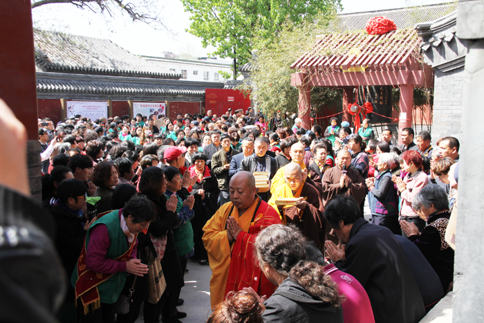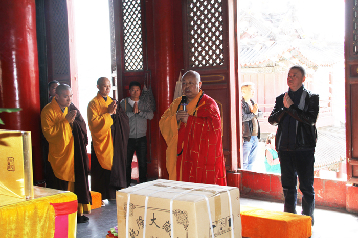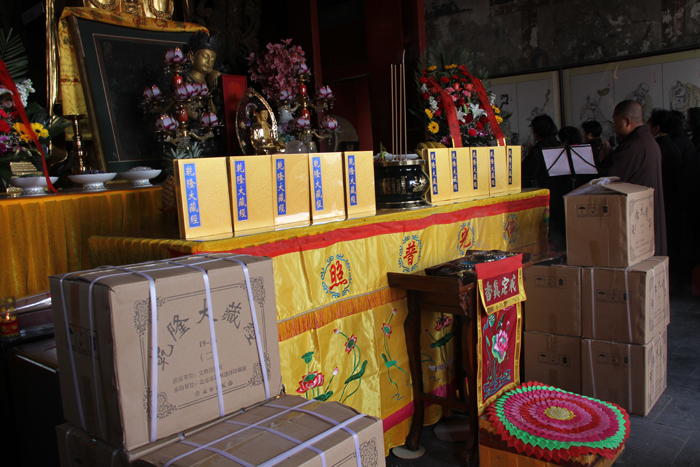 上午十时,运载法宝的车队来至大慈阁,寺院的大众居士齐声称颂释迦牟尼佛圣号,列队欢迎,法宝在香花引礼下来到大殿,举行了法宝供养交接仪式。