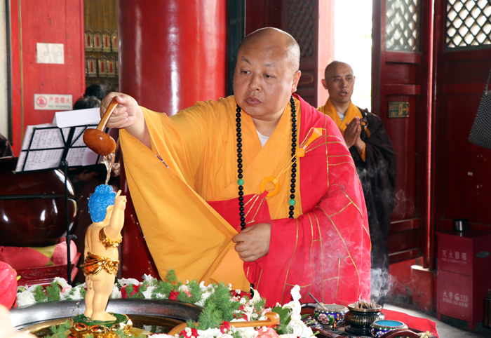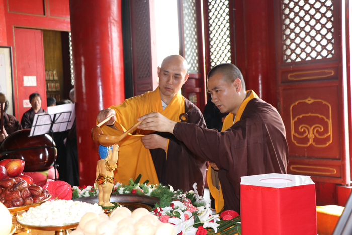 接下来的环节由会长真广法师带领大家开始浴佛,大家怀着虔诚敬仰的心给“太子”沐浴,并希冀佛陀慈悲之光照亮自己的心,佛陀的法雨洗去自己内心的尘垢。