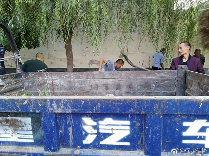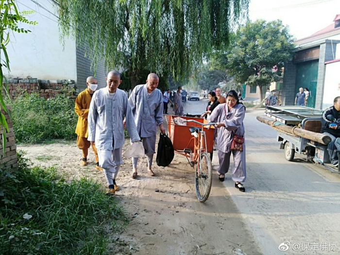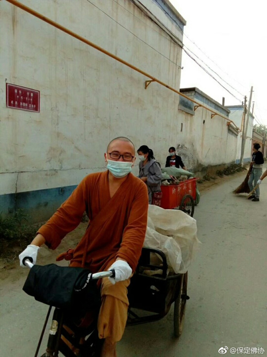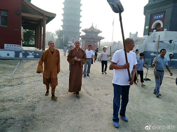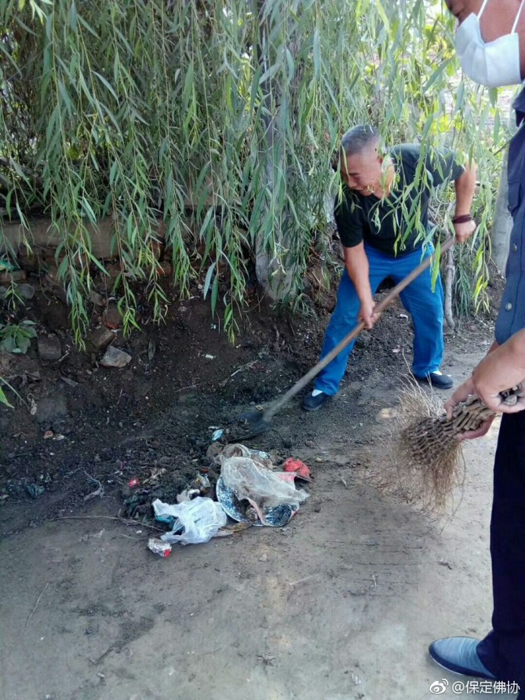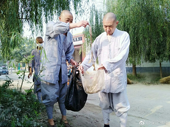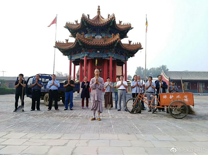 保定佛教资讯:2017年9月7日,保定清苑区观音寺僧俗大众在知客道贤法师带领下出坡,到国公营村帮助清理道路两旁的垃圾杂物,美化乡村环境。