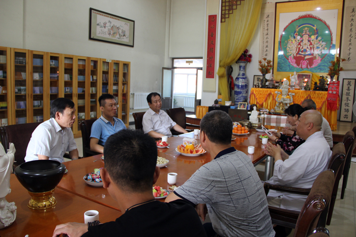 保定佛教资讯:2017年9月8日,国家宗教事务局四司王晓刚处长到我市清苑区观音寺调研考察民间信仰转化问题,陪同调研的还有河北省民宗厅宗教一处调研员郑会民,宗教一处主任科员李斌斌,市民宗局赵守万副局长,一处甄彩霞处长等领导,市佛协会长真广法师及观音寺僧众热情接待了各位领导。