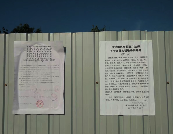 保定佛教资讯:2017年9月20日,自莲池区八个部门9月15日联合发出治理大慈阁周边烧香山乱象之后,已过去5天了,迎来了第一个” 初一”,治理前的初一,广场上是浓烟滚滚,灰尘遍地的景象,现在完全改变了,整体环境明显好转,蓝天白云映照下的大慈阁巍峨庄严,寺院内时时传出优美的佛教梵音,在大慈阁广场上下棋休闲的老人们对治理行为赞不绝口,称赞这是政府为老百姓办的大大好事。