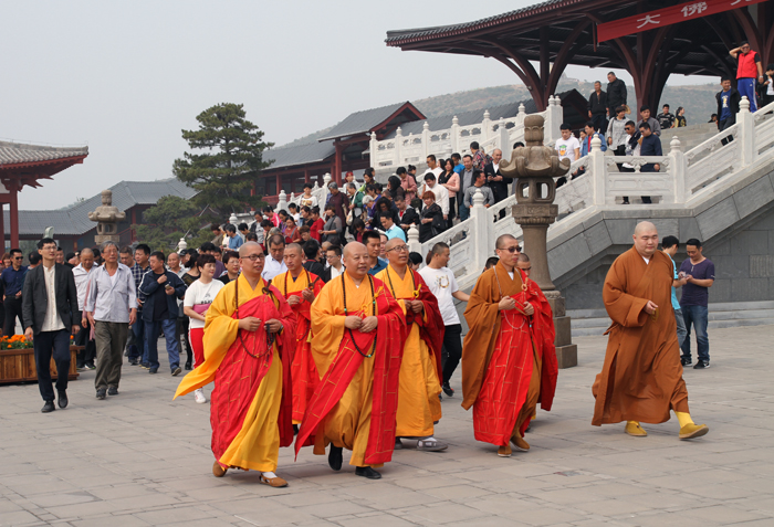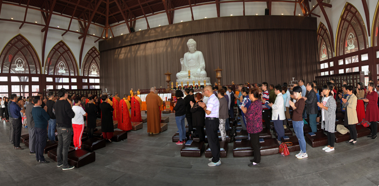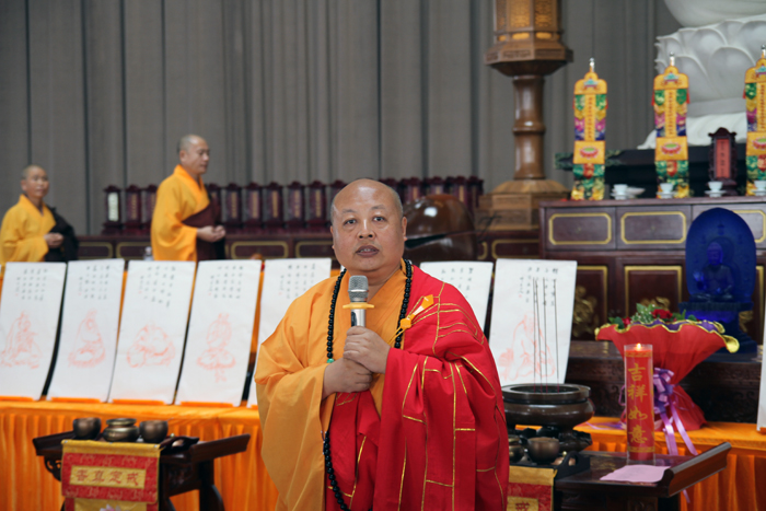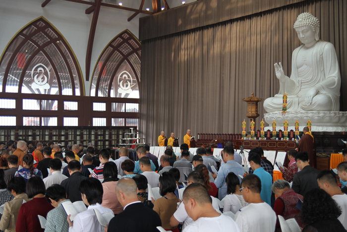 接下来,真广法师、寂禅法师、能觉法师、妙严法师、道悟法师、道智法师等共同诵读《药师经》,为祖国、为大众祈福,祈愿我们伟大的祖国繁荣昌盛、早日实现中国梦,祈愿大众身体健康、幸福吉祥。