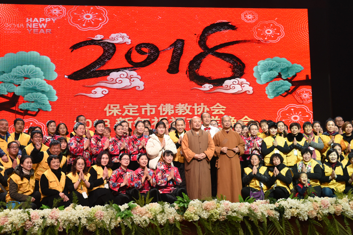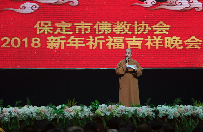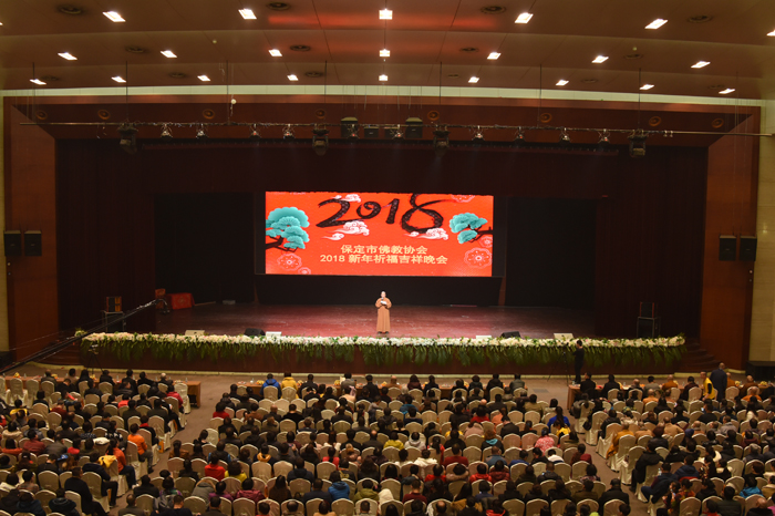 保定佛教资讯:2017年12月30日晚7时,保定市佛教协会在电谷国际酒店会展中心举办了2018新年祈福吉祥晚会,各界人士欢聚一堂,迎接新的一年,共同为我们伟大的祖国祈福,市民宗局刘聪慧副局长等领导参加了晚会,著名表演艺术家游本昌等人为大家表演了精彩节目。