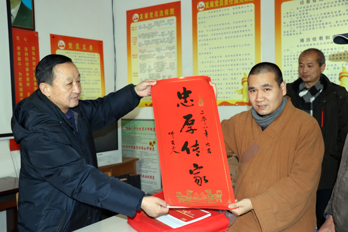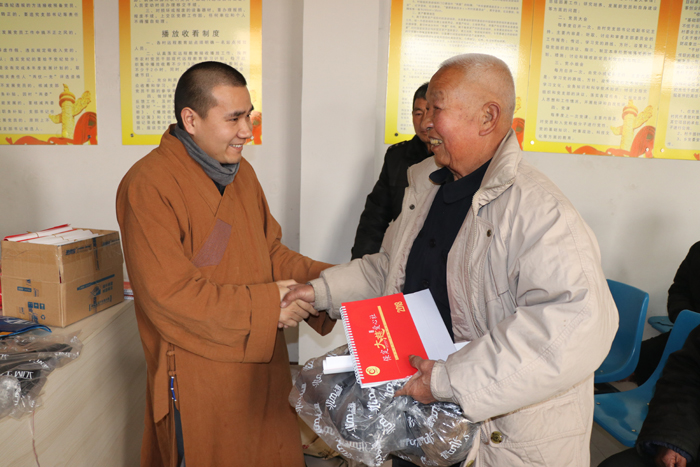 在慰问活动中,大慈爱心社副社长道悟法师还为大家结缘了会长真广法师的新年祝福春联“忠厚传家“,以及大慈阁台历。