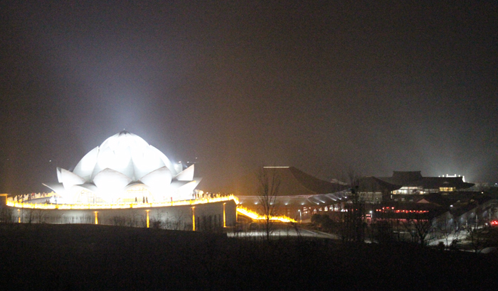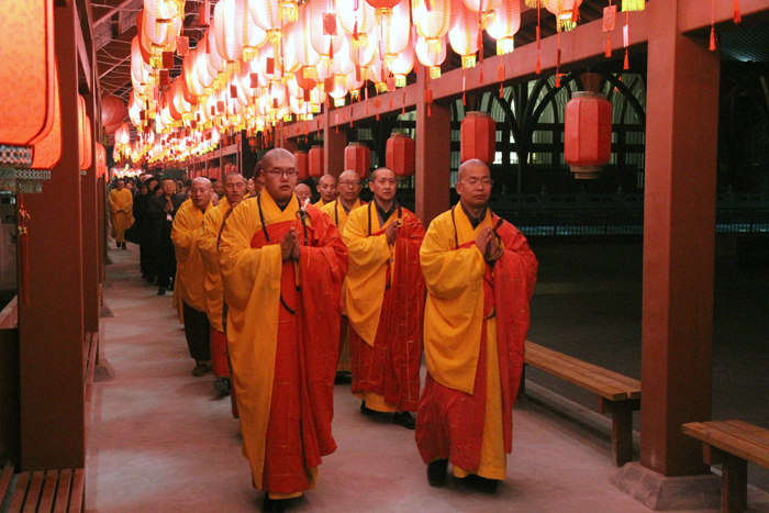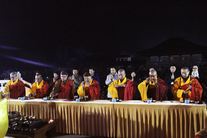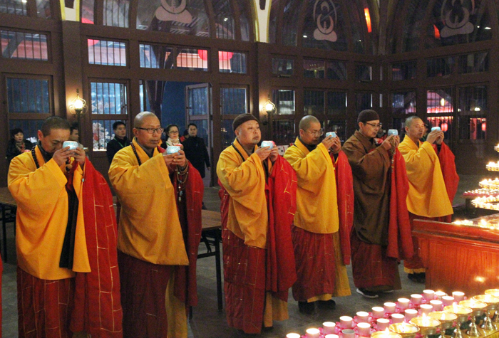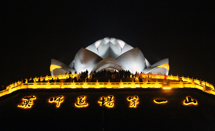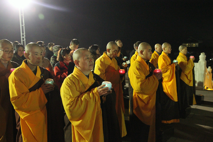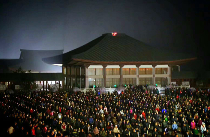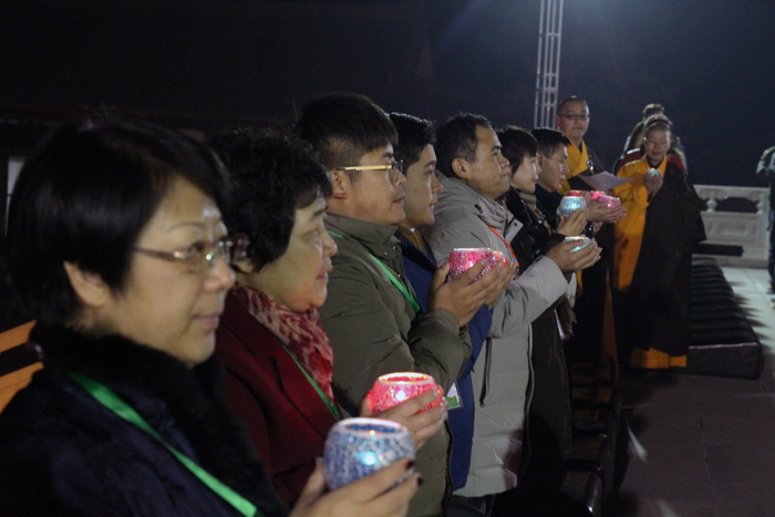 接下来由大佛光寺开山尊长真广法师带领大家共同祈愿,并点亮供养佛陀的大莲花灯,灯灯相传,相互照映。广场上的人们仿佛置身在灯的海洋里,一盏盏明灯象征着众生的“心灯”,在皎洁的月光映照下的大佛光寺内闪耀,分外庄严,尤其是凤凰山上在灯光映射下的莲花药师宝殿,静静绽放着它洁净无染的美丽,并成为大众最喜欢的具有地标性质的佛教殿堂。
