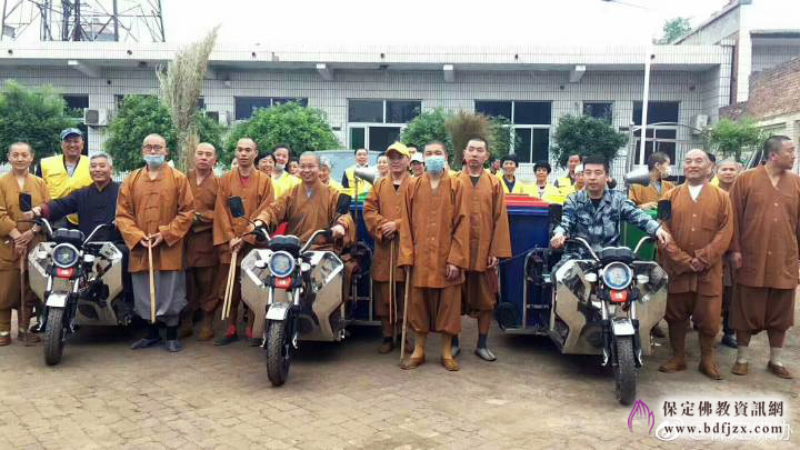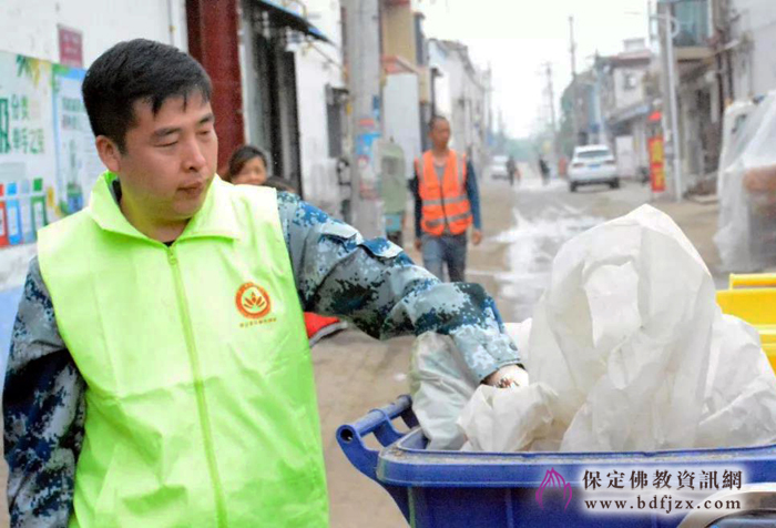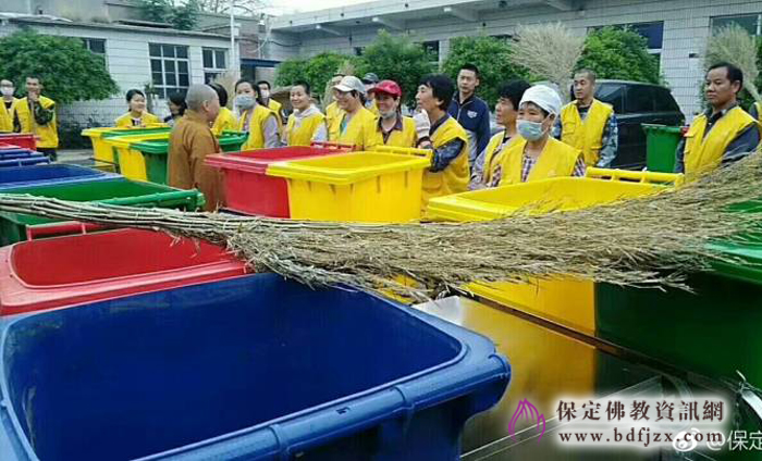 保定佛讯:2018年5月11日,保定观音寺组织全体僧俗大众,在住持寂禅大和尚的带领下,在寺院所在地国公营村在村两委班子配合下,于村内宣传环保理念、提升环保意识,开展“垃圾分类、净塑环保大善行”活动,持寂禅法师、韩松村长带头参与。