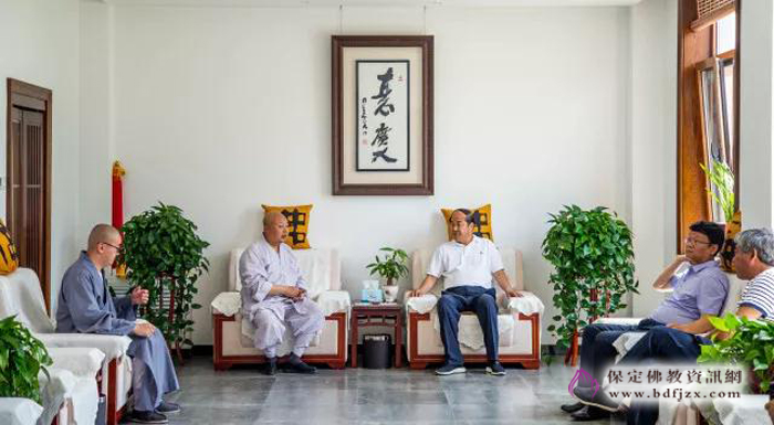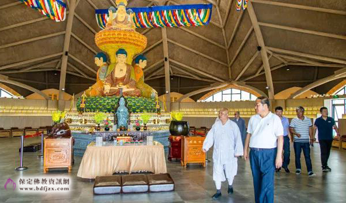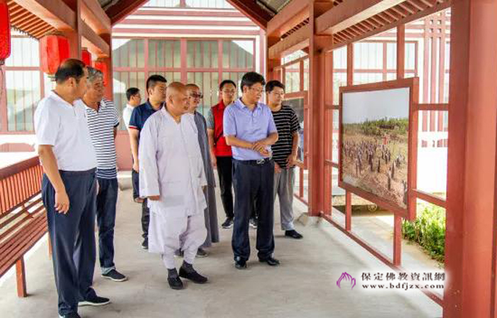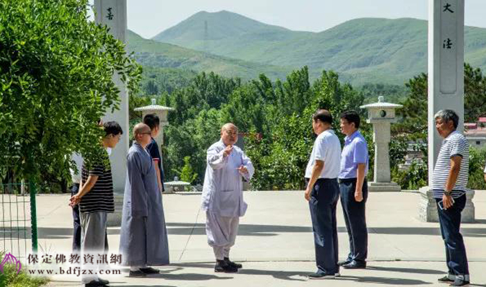 保定佛讯: 2018年6月5日,保定市人大常委会主任马誉峰、市人大副主任刘峰及市人大研究室、民侨委等有关领导一行,到大佛光寺调研,市佛协会长、大佛光寺开山尊长真广法师,总干事道龙法师介绍了大佛光寺规划、建设理念。