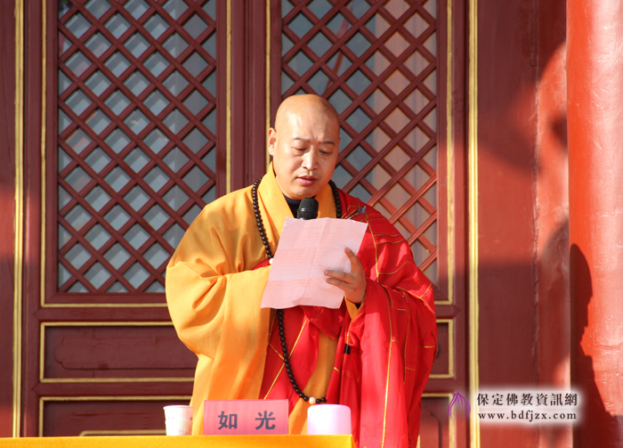 在主席台就坐的领导和法师,王长革秘书长主持典礼