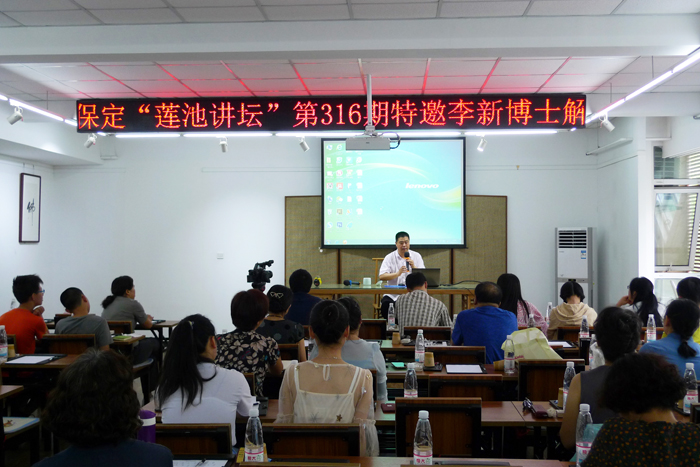 保定佛讯:2019年5月25日,保定“莲池讲坛”第316期特邀李新博士解读《汉末“黄天当立”与五行新说》,李新博士与“莲池讲坛”缘分甚深,多次莅临“莲池讲坛”,此次李新博士从学术的角度阐释了汉末的历史文化,并结合古典名著和传统文化中的五行学说,李新博士的博学多才和灵活的讲解方式,获得了大家的欢迎,增加并丰富了大家对传统优秀文化的了解和喜爱。