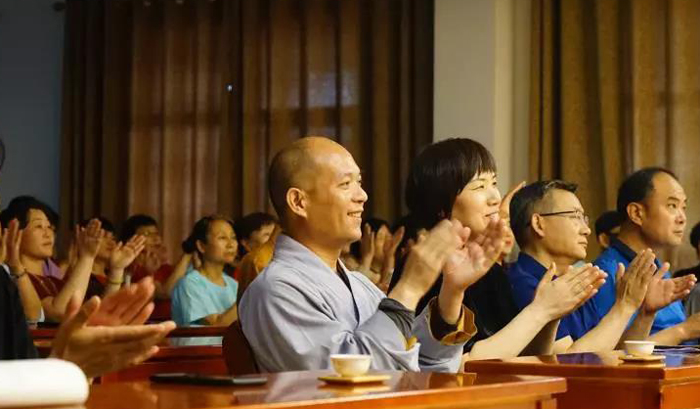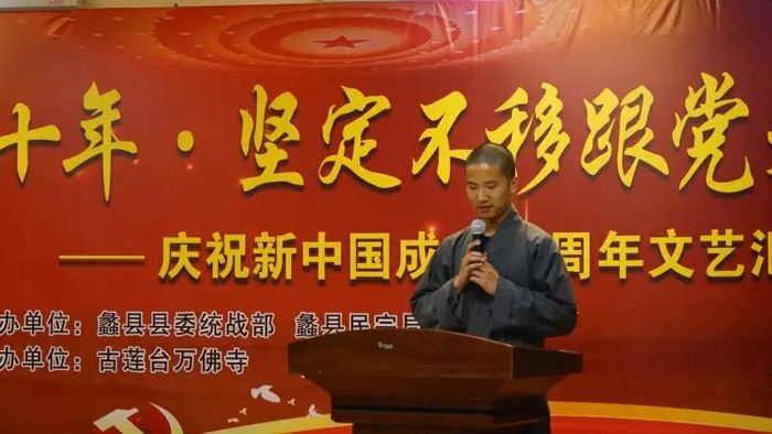 万佛寺监院悟光法师为此次汇演致辞:悟光法师重申此次文艺汇演的主题:庆祝新中国成立七十周年——同愿同行七十年,坚定不移跟党走。在过去的一年,万佛寺四众弟子在蠡县县委县政府的监督指导下,在道泓大和尚的带领下,如理如法地带领信众举行法会。发扬了中国佛教爱国爱教的优良传统,始终坚持佛教中国化方向,努力促进佛教与社会主义社会相适应,庄严国土、利乐有情,为建设中国特色社会主义伟大事业、实现中华民族伟大复兴发光发热。